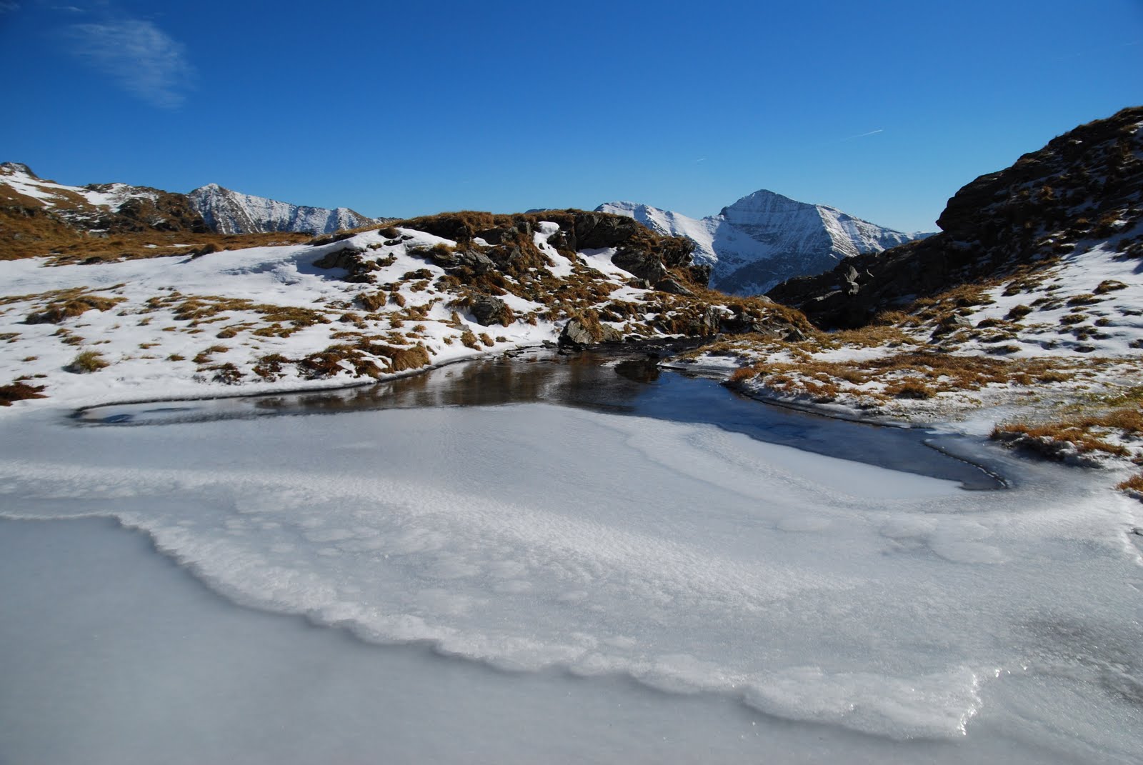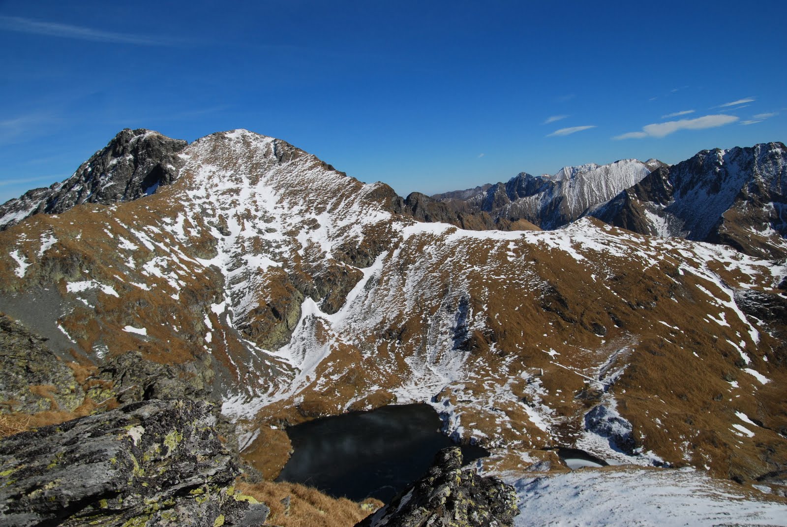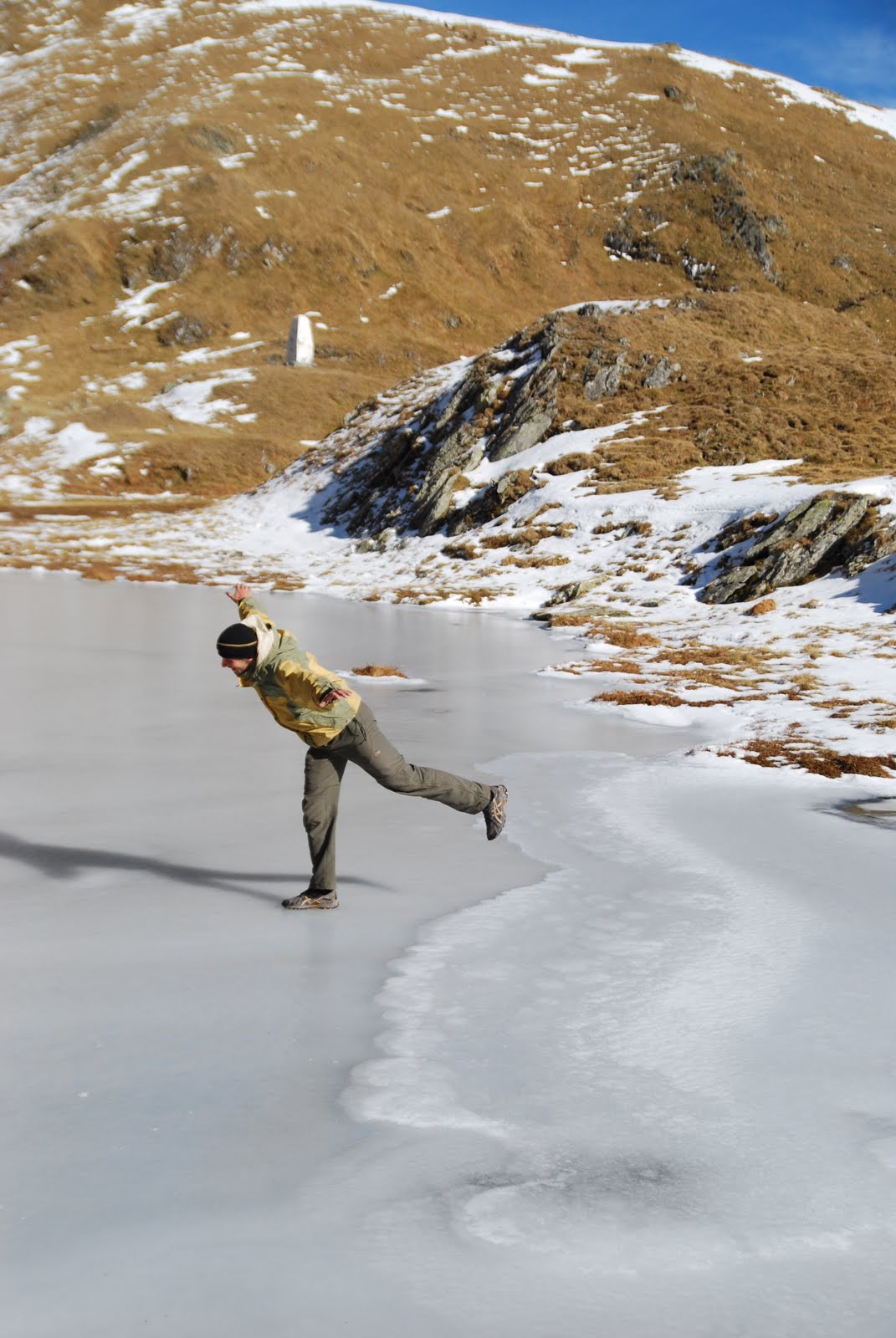 Plecam intr-un final,la glorioasa ora 11.00 spre Lacul Capra, pe marcaj CA care pleaca de la Punctul Salvamont. Poteca e interesanta, nu am fost niciodata pe aici. Dam si de zapada, prima mai serioasa pe anul acesta. Abia acum realizez ce au insemnat turele la munte, cataratul, tot ce am facut pana acum. Cata dezinvoltura in miscari am capatat si cum nu imi ramane decat sa ma bucur de vremea minunata. Este cald, poti sa mergi in tricou, simt cum soarele iradiaza in stanga si dreapta. De jur-imprejur, cu cat urcam, varfurile sunt pline de zapada. Abandonam Vanatoarea lui Buteanu si urcam Iezerul Caprei. Aici vant si zapada inghetata pe poteca de creasta. Asa ca revenim la CA si coboram la Lacul Capra. Un apendice al lacului s-a transformat intr-un minunat patinoar. Cum coborarea spre Balea Lac este inghetata si total nepotrivita pentru oamenii cu care suntem, ramanem pe versantii sudici si coboram inapoi la Transfagarasean pe BA. Am avut de-a face cu un munte frumos, cu oameni faini care au descoperit un munte frumos, care si-au depasit frici si temeri, care au ramas pe varf sa ii bata vantul admirand Moldoveanu si Negoiu si am incheiat totul cu o portie geniala de paste cu care sa astamparam foamea zilei…cea din stomac, caci pe restul le-am astamparat…pentru o saptamana sau doua, cand vom pleca din nou in cautarea aventurii, sub ce forma va fi ea.