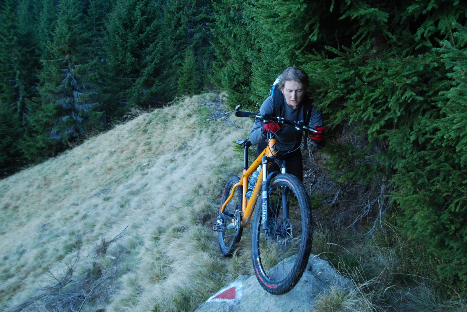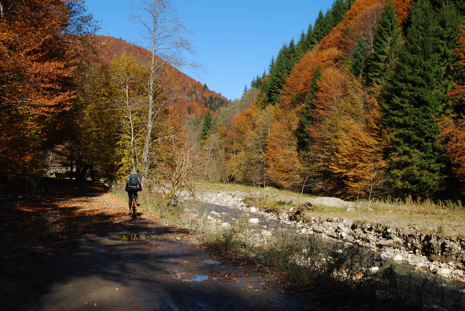 De fapt am vazut doar pozele mai demult, am salvat linkul si acum mi-am adus aminte de el…am ajuns si pe la descriere dar am citit in diagonala. Ne-am prins numai ca oamenii au facut tura in 2 zile…Noi nu aveam decat ziua de sambata la dispozitie…Am calculat si distanta in mare si diferenta de nivel si am zis ca nu e mai mult decat cea din tura cu Em deci o zi lumina fie ea de toamna parea suficienta….Parea J. Am sarit si peste 3 ore bicla carata pe poteci accidentate si am retinut ceva doar legat de bicla–bajag de mana.