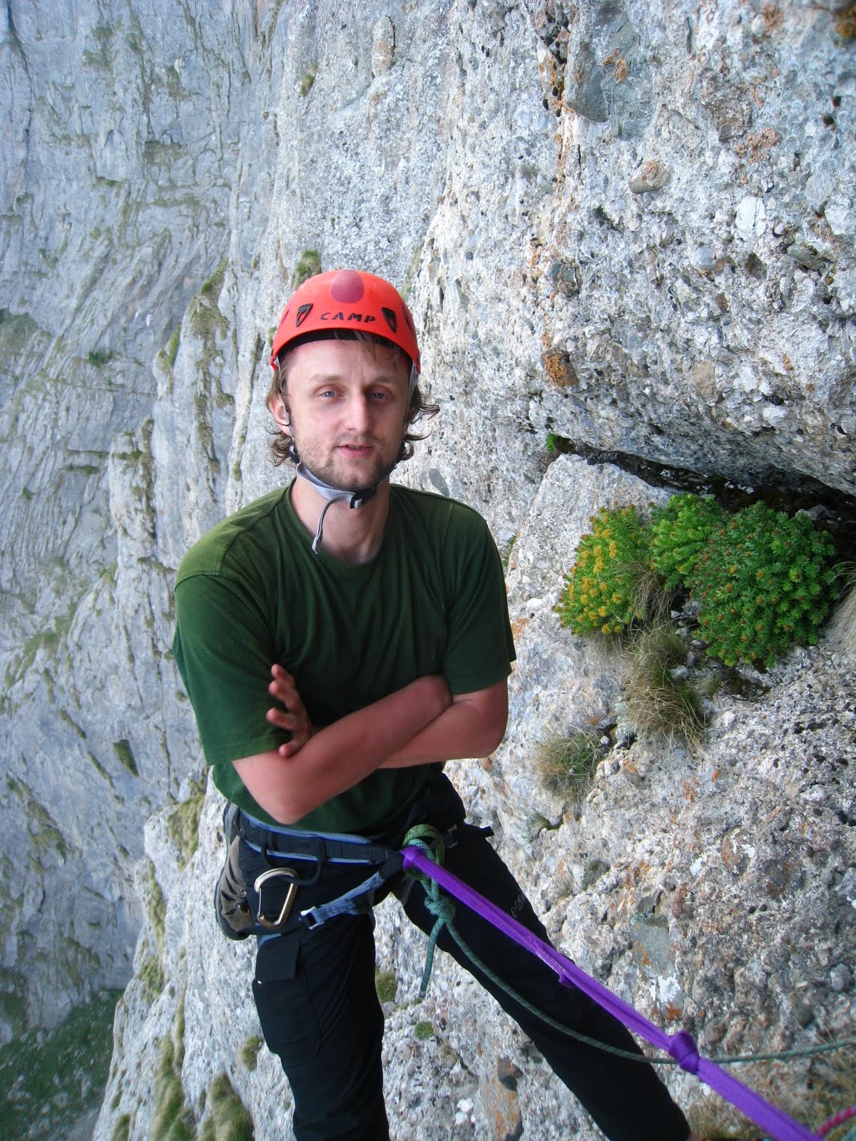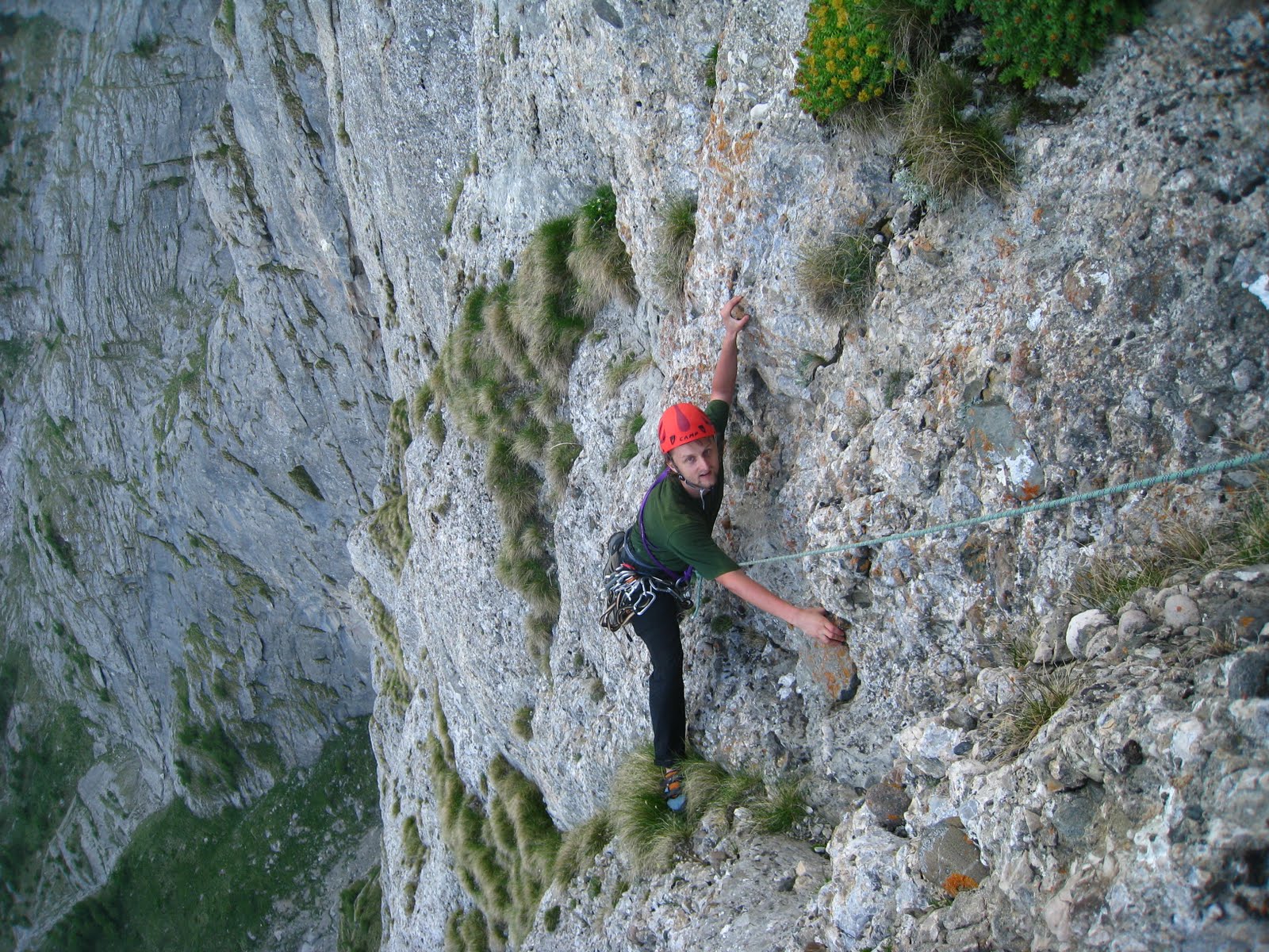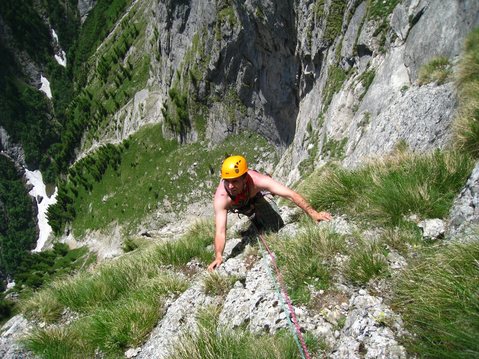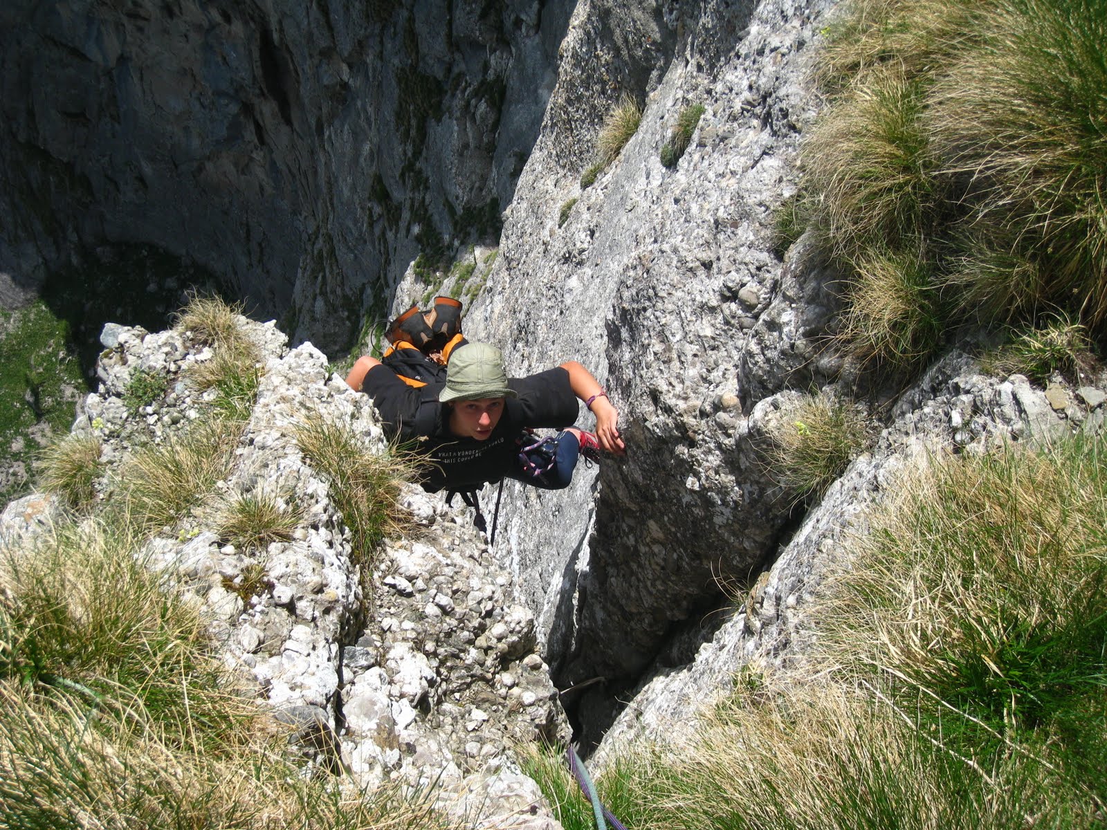 In mod normal primele lungimi din traseul le-am fi parcurs tandem daca eram doar eu si Radu, dar asa, in 3 e ceva mai complicat. Alegem deci sa facem lucruile ca la carte, sa regrupam de cate ori e nevoie etc. Primele 3 lungimi sunt o placuta plimbare pe brane si pernute de iarba, mici pasaje de conglomerat si 1 horn mai interesant. Ne straduim sa ne miscam cat mai repede pe acest teren facil. Partea grea este ca acum taram dupa noi si un rucsac cu ceva mancare si mai ales cu multa apa (minim 4 l) cu care ma strecor cu greu prin horn ..in felul asta imi spal toate pacatele de pe traseele din ultimul sezon cand am mers fara bagaj in spate, in stilul rapid veni-vidi-vici.